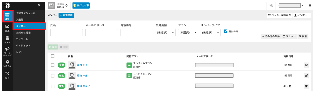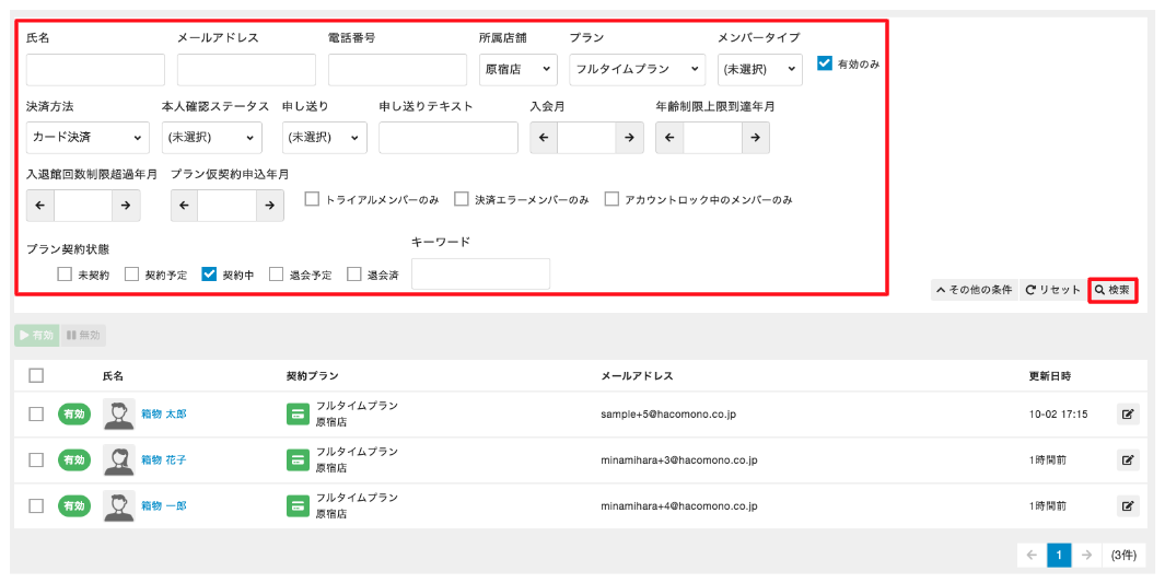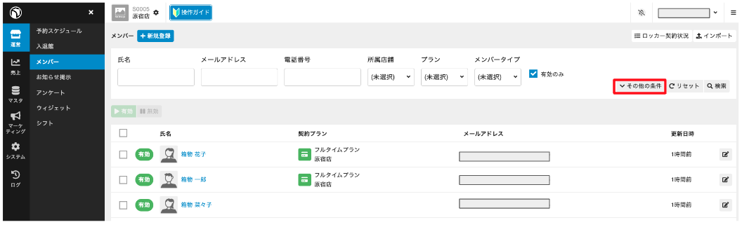 | 所属店舗 | メンバーの契約しているプランの所属店舗。 プランを契約していない場合は、メンバーの基本情報の所属店舗が検索条件として扱われます。 |