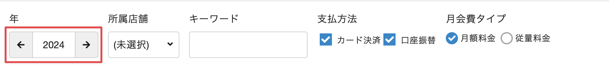 2. [年]から確認対象の年を選択し、必要に応じて[所属店舗]、[支払方法]などを選択します。
