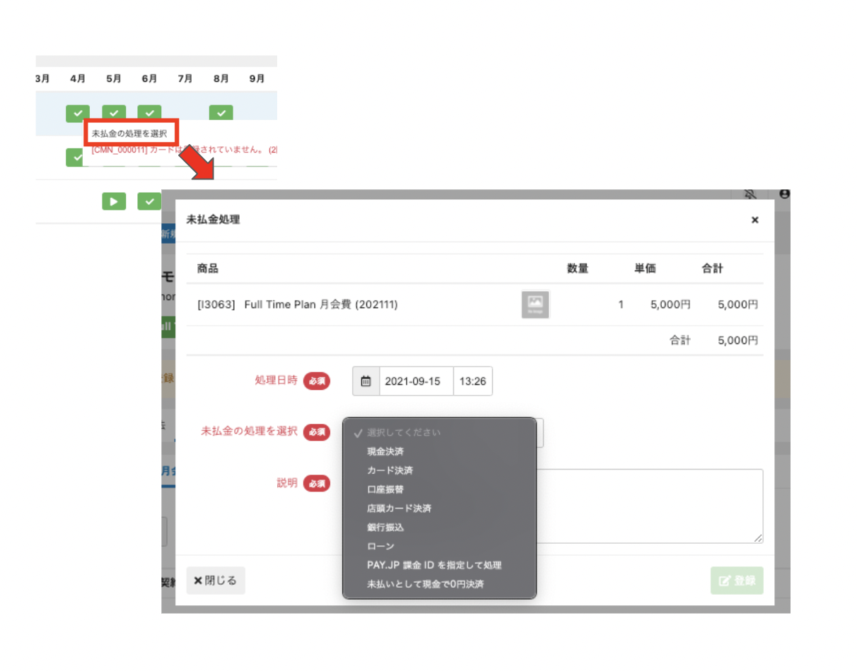 管理サイトのサイドメニューの[売上]>[月会費支払状況]から未払いになっている会員の【 × 】または【 ! 】をクリックし、【未払金の処理を選択】を選択します。