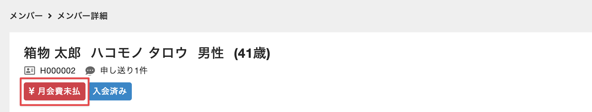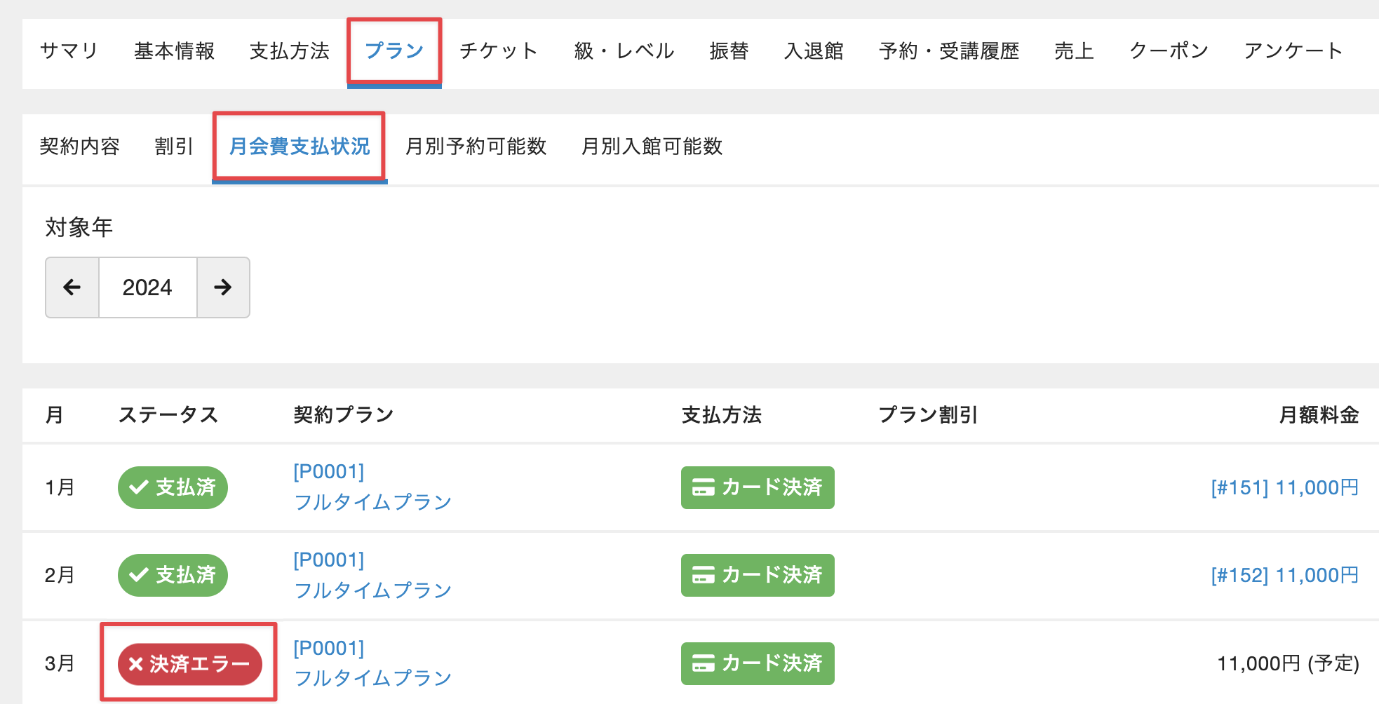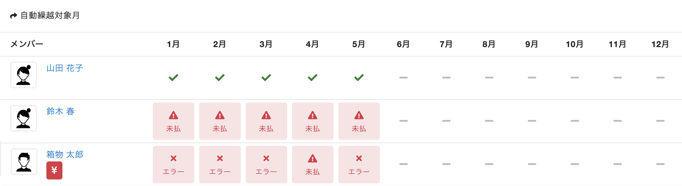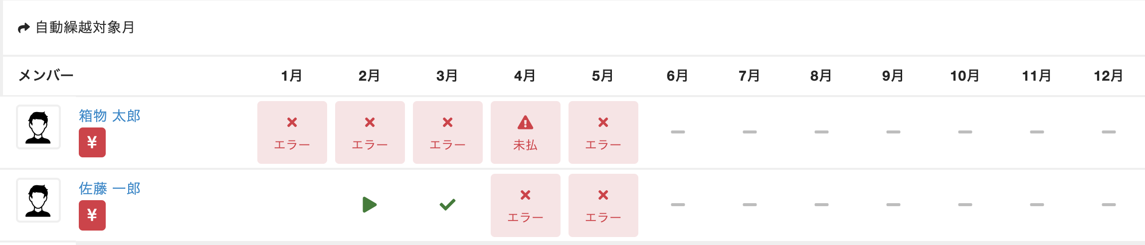 決済エラーが発生しているお客様については、管理サイト上に「月会費未払エラー」と表示されます。