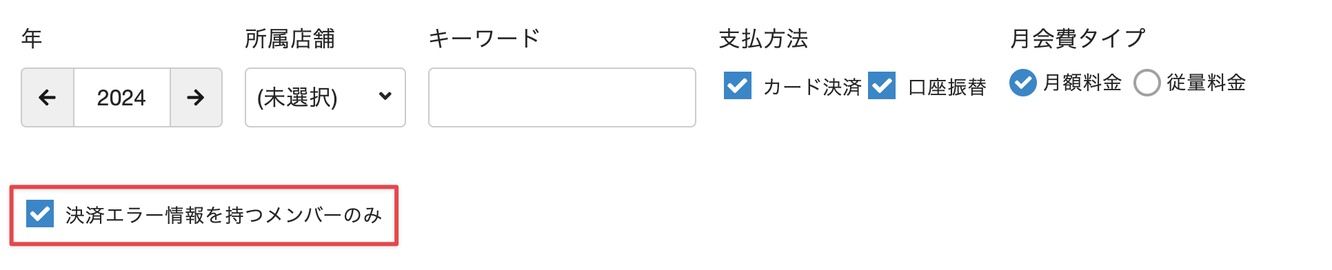4. 決済エラーが発生しているお客様だけを表示する場合、[決済エラー情報を持つメンバーのみ]にチェックを入れます。