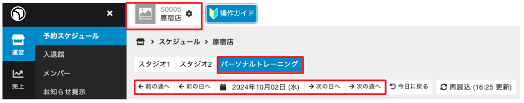 1.[運営]>[予約スケジュール]を選択し、キャンセルする店舗、予約カテゴリ、レッスンの日付を選択します。