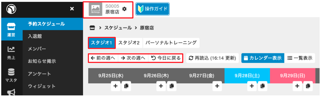 1.[運営]>[予約スケジュール]を選択し、キャンセルする店舗、予約カテゴリ、レッスン日の週を選択します。