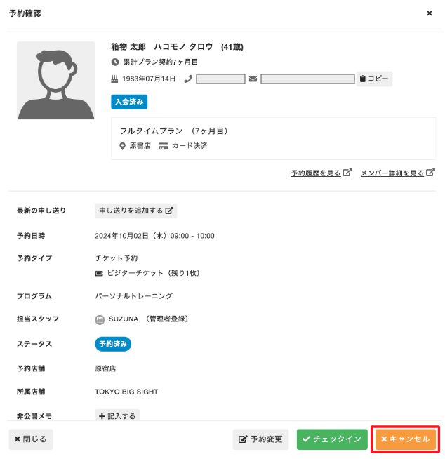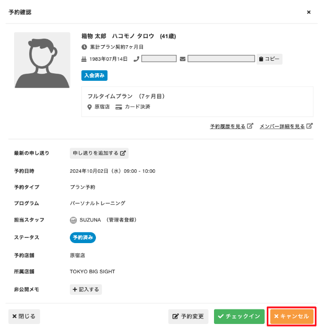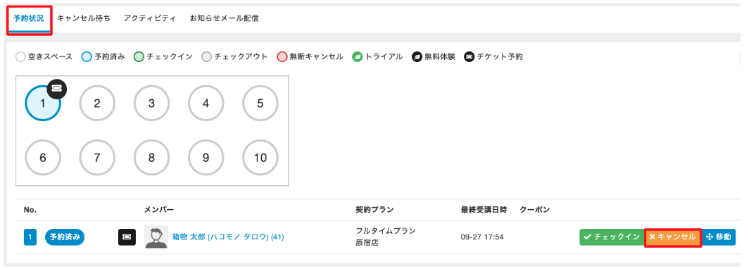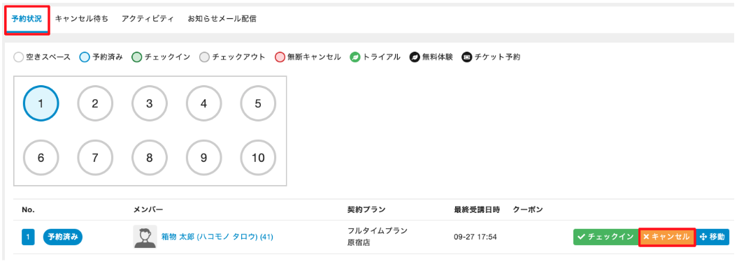 5.キャンセルすると、予約に使用したプランの予約権利がメンバーに戻 されます。 管理サイトから予約をキャンセルした場合、メンバーへ予約キャンセルメールは送信されません。