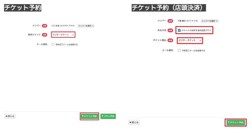 [支払方法]の[チケットの決済を当日店頭で行う]にチェックを入れると、チケットを所持していなくてもチケット予約が可能です。