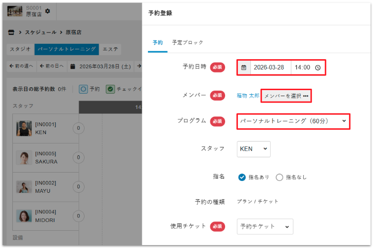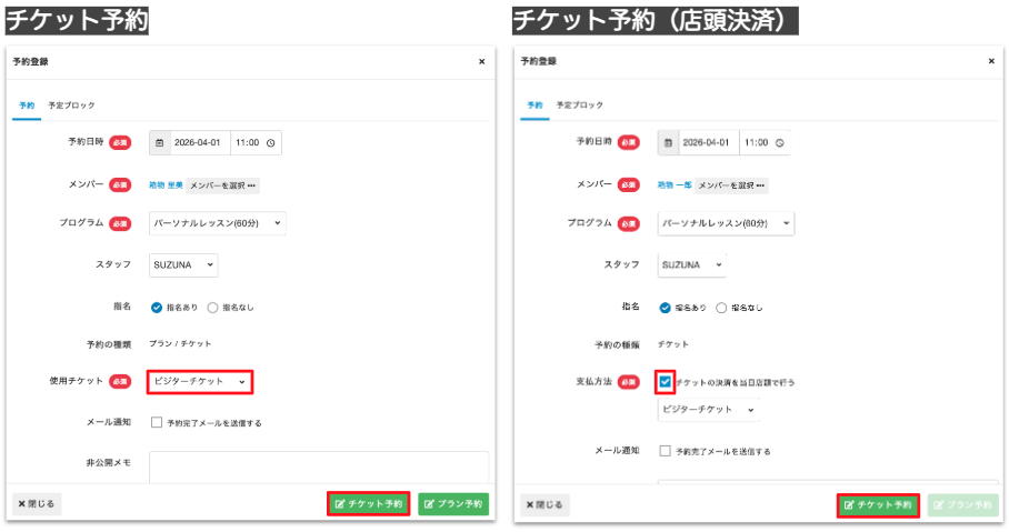チケットで予約したい場合は、[使用チケット]からチケットを選択し、[チケット予約]をクリックします。