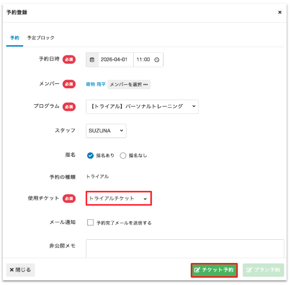 チケットで予約した い場合は、[使用チケット]からチケットを選択し、[チケット予約]をクリックします。