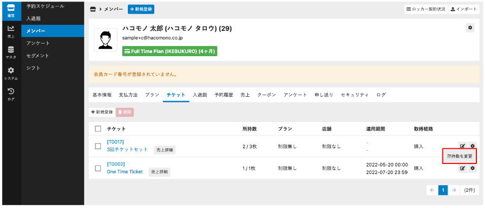 2.[チケット]タブを開き、枚数を減らしたい所持チケットの歯車マークのボタンをクリックし、[所持数を変更]をクリックします。