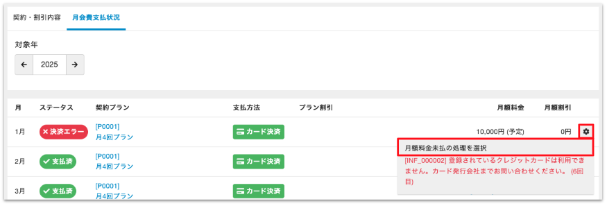 - 決済エラーが適用期間外となるような適用期間の更新をすることはできません。未払金処理を行ってください。[MBR_000194]