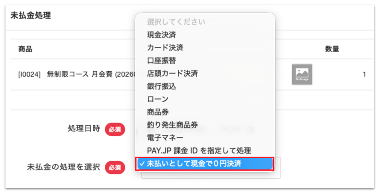 未払いの月会費の請求について、登録中のクレジットカードで決済する場合は[未払金の処理を選択]から「カード決済」を選択します。
