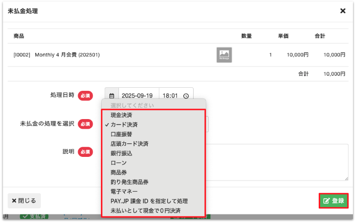 その場合は[未払金の処理を選択]から「現金決済」を選択し[登録]をクリックします。