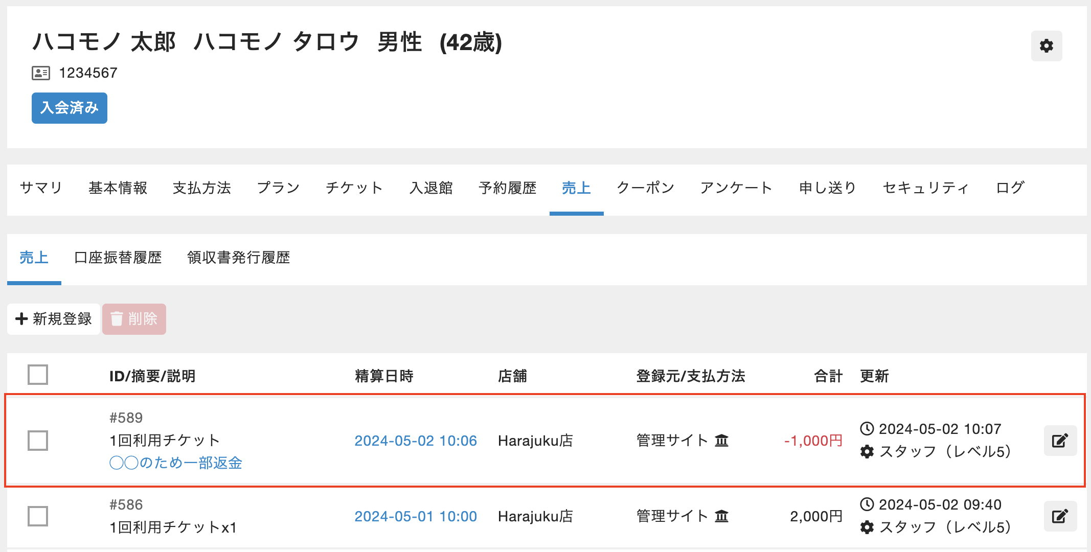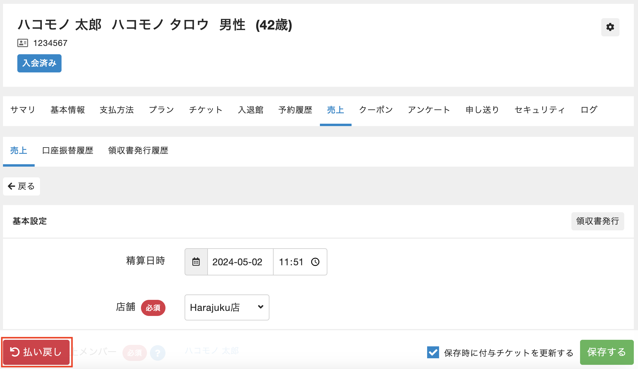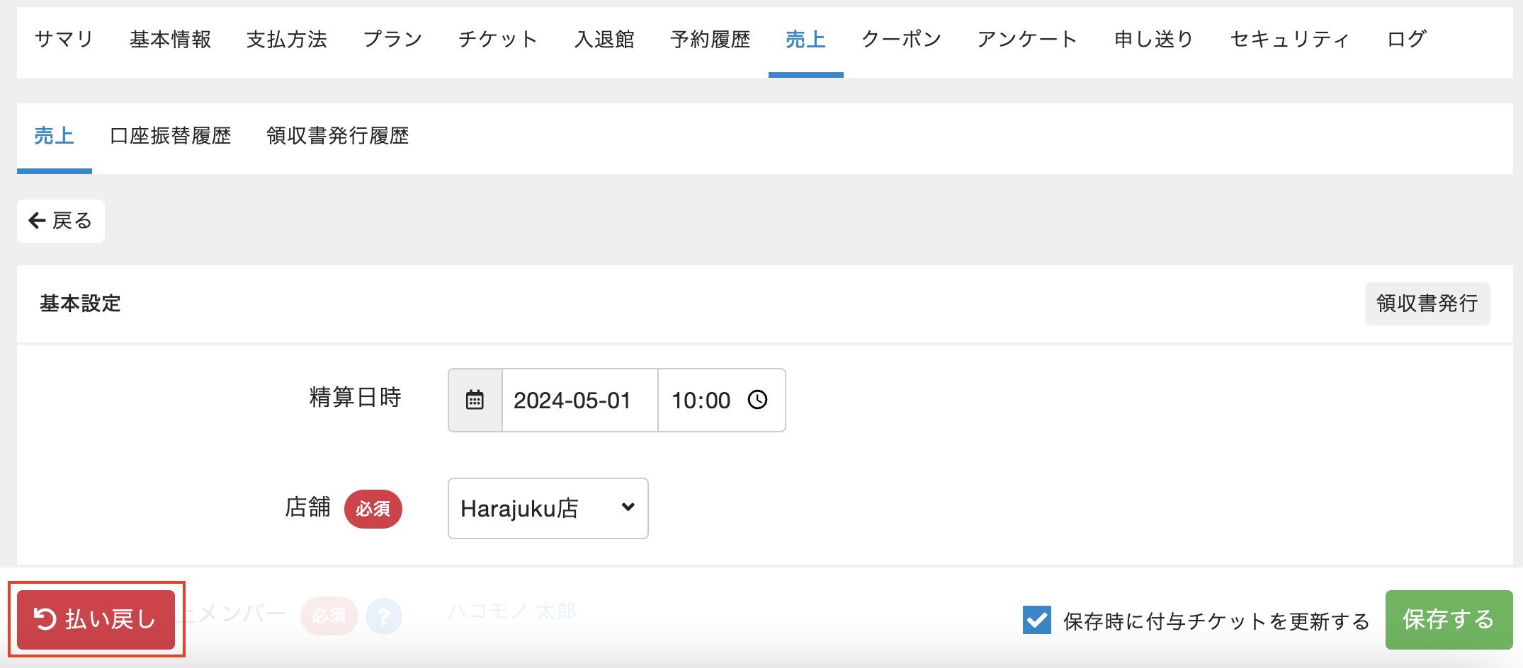 口座振替の売上を払い戻しする場合、hacomono上で払い戻し操作を行った後に、お客様へ直接現金で返金いただくか銀行での口座振込等でご対応いただく必要がございます。