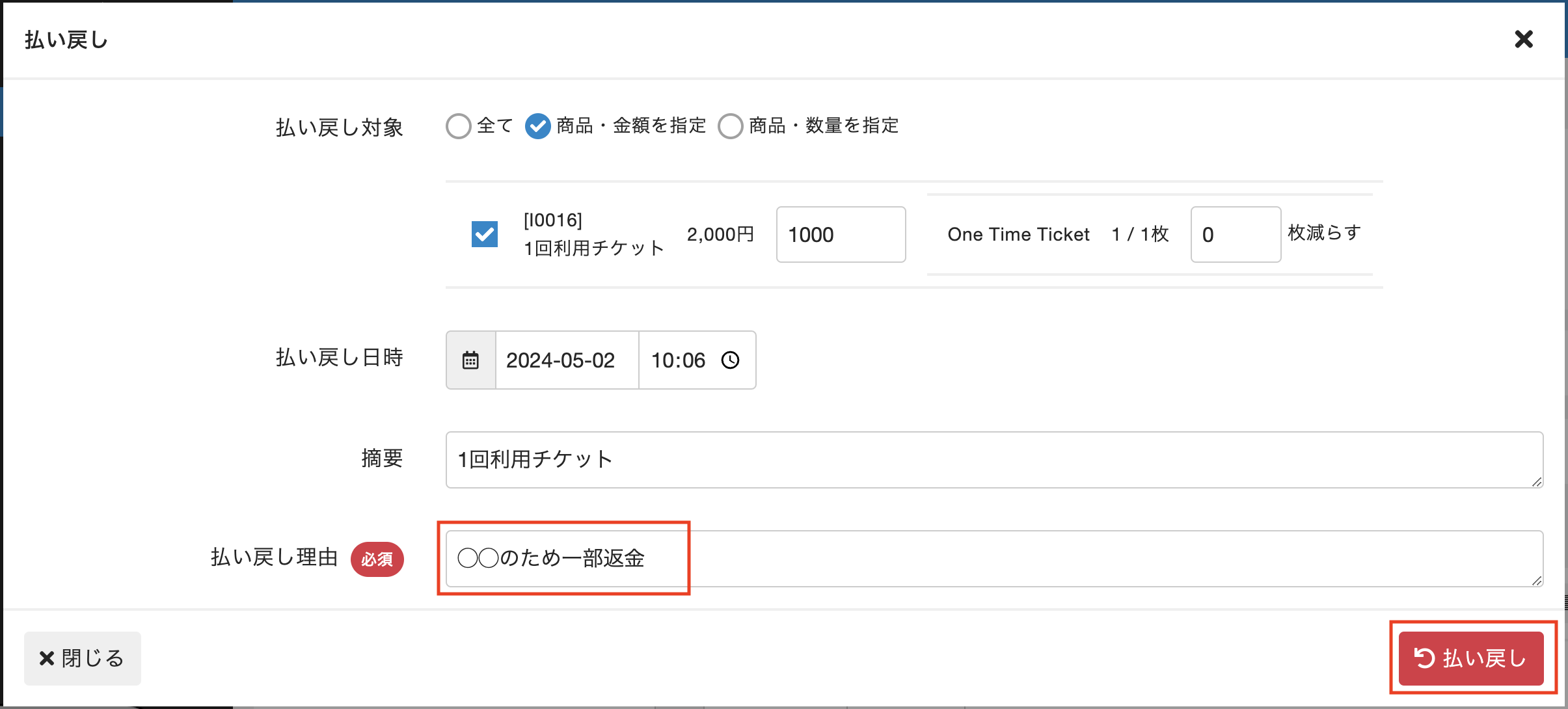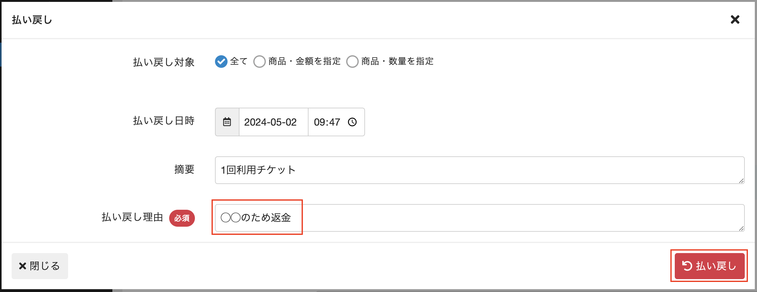 | 払い戻し対象 | 払い戻す対象。 ・[全て]:売上項目の[明細]にあるすべての商品に対して、全額払い戻しを行う場合に選択します。 ・[商品・金額を指定]:売上項目の[明細]の一部の商品に対して、商品や金額を指定して払い戻しを行う場合に選択します。表示された商品一覧から該当の商品にチェックを入れ、払い戻す金額を入力します。 ※払い戻す金額を入力するときは、金額のみ入力します。-(マイナス)の入力は不要です。 ※売上項目の対象がチケットの場合は、チケットの所持数を減らすことができます。払い戻す金額を設定後、減らす枚数を入力してください。 ・[商品・数量を指定]:売上項目の[明細]の一部の商品に対して、商品や数量を指定して払い戻しを行う場合に選択します。表示された商品一覧から該当の商品にチェックを入れ、払い戻す商品の数を入力します。 |