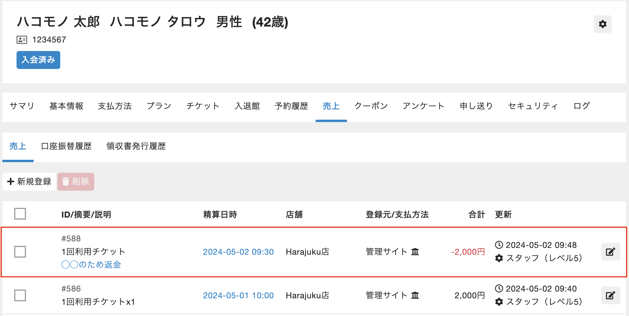 hacomono上の払い戻しの操作を行っても自動でお客様の利用口座に返金されることはございませんのでご注意ください。