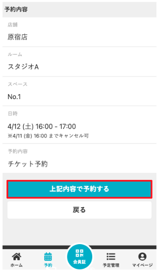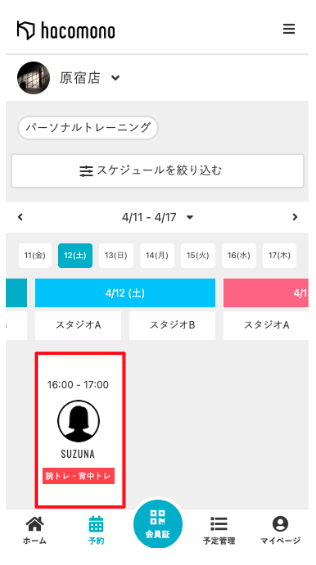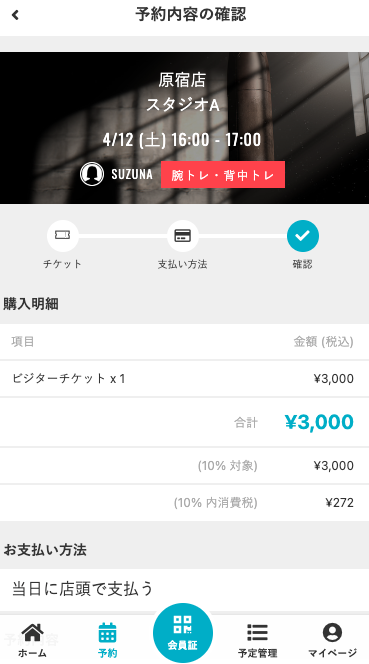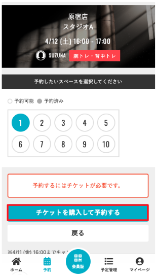支払方法が「店頭決済」のチケットは、予約スケジュールからレッスンを予約する際に購入ができます。