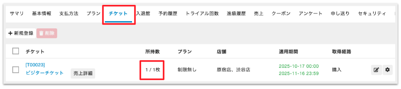 5.[チケット]から該当チケットの[所持数]が戻っていることをご確認ください。