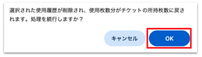 4.「選択された使用履歴が削除され、使用枚数分がチケットの所持枚数に戻されます。処理を続行しますか?」のメッセージが表示されるので、[OK]をクリックします。