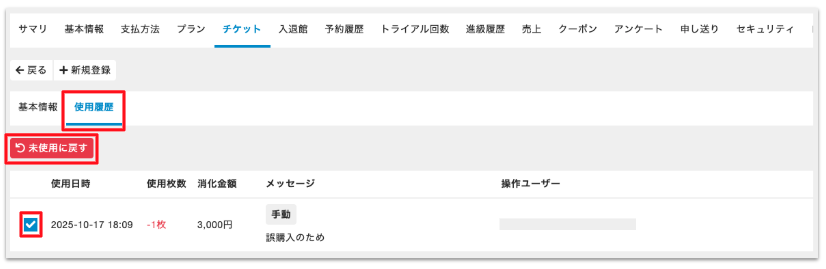 3.[使用履歴]から該当のチケットにチェックを入れて[未使用に戻す]をクリックします。