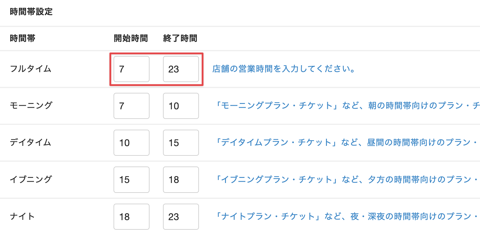 また、日中だけ利用できるデイタイムプランや、早朝だけ利用できるモーニングプランなど、店舗の利用時間を制限したプラン・チケットを提供する場合は、各時間帯の開始・終了の時間を店舗マスタに設定します。