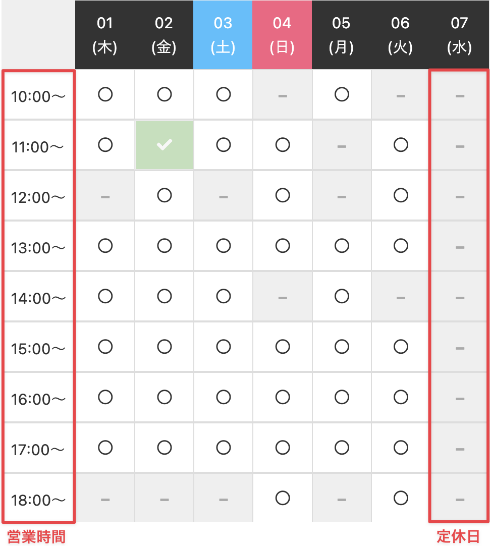 店舗ごとの予約可能時間や定休日を事前に設定しておく必要があります。