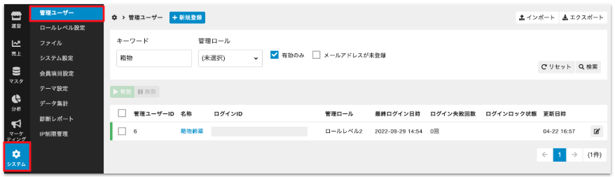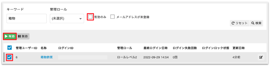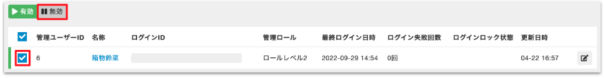 そのため、不要になった管理ユーザーは「無効」処理をお願いいたします。