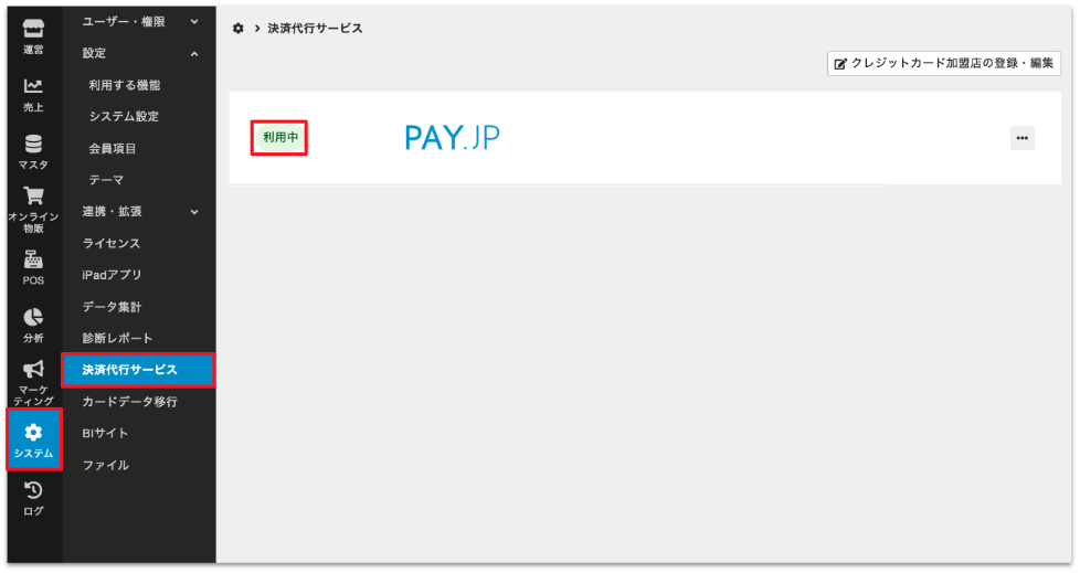 [システム]>[決済代行サービス]から「利用中」と表示されているものが利用中のカード決済代行サービスとなります。