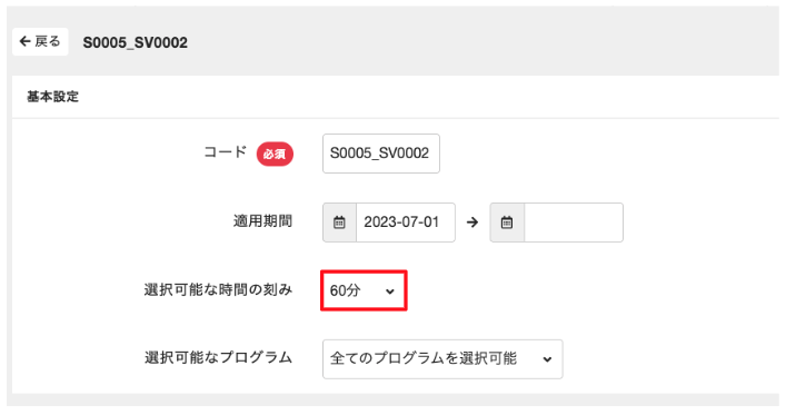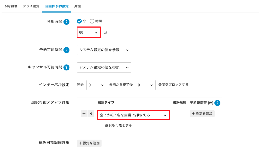 [自由枠予約設定]の[利用時間]はパーソナルトレーニングのレッスン時間の「60」分と設定します。