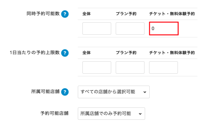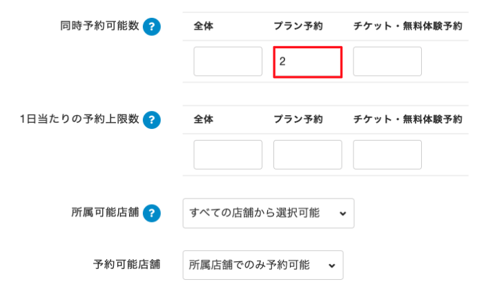 13.[同時予約可能数]の「プラン予約」と「チケット・無料体験予約」を「2」と設定します。