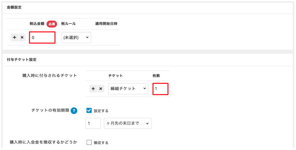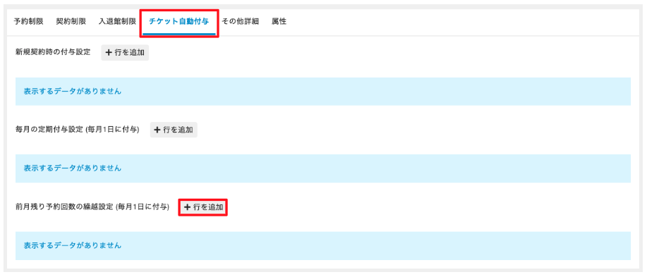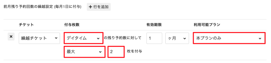 15.[チケット]に繰越チケットを設定し、[付与設定]は「デイタイム」の残り予約数に対して「最大2枚を付与」と設定します。