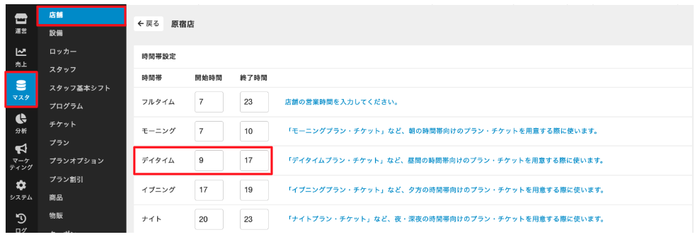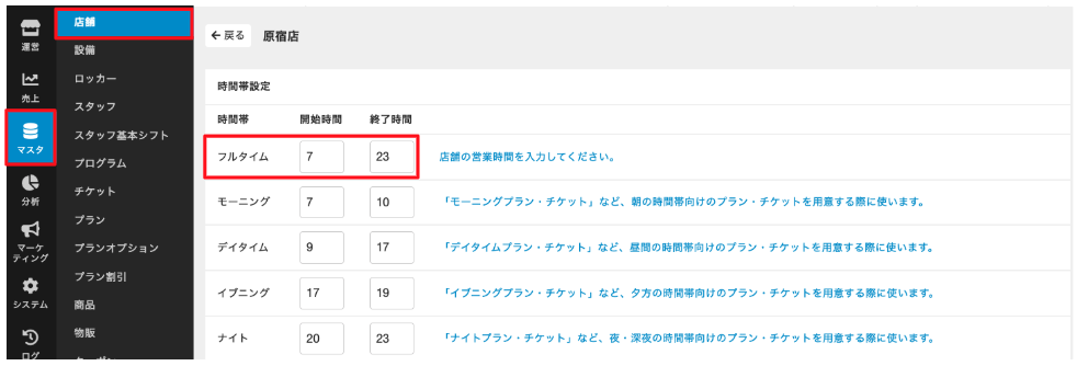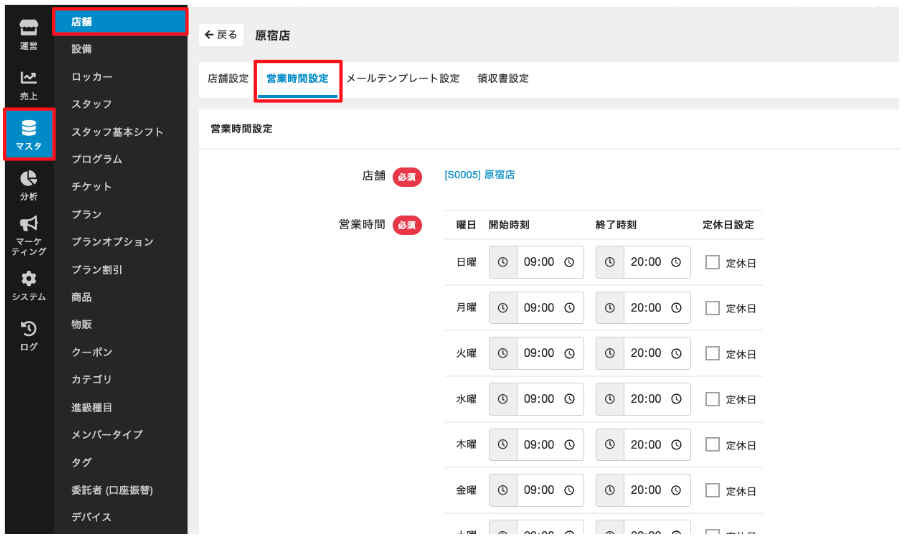 [マスタ]>[店舗]>[営業時間設定]から設定が可能です。