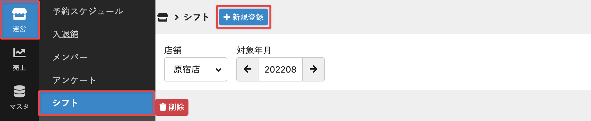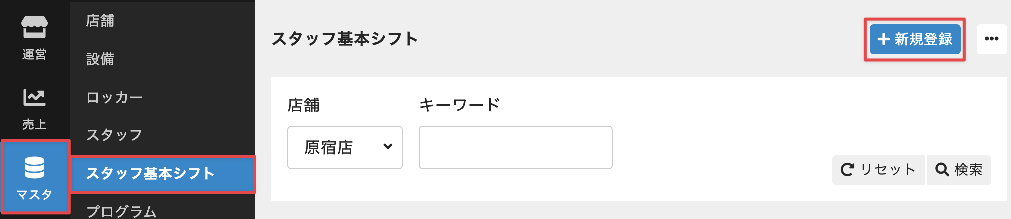 [マスタ]>[スタッフ基本シフト]>[新規登録]から設定が可能です。