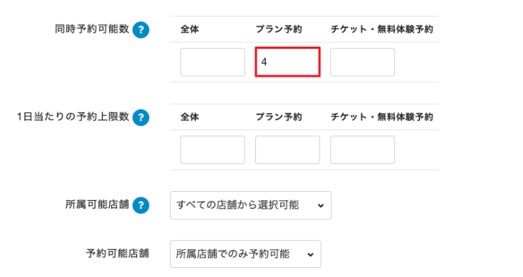 6.[同時予約可能数]の「プラン予約」を「4」と設定します。