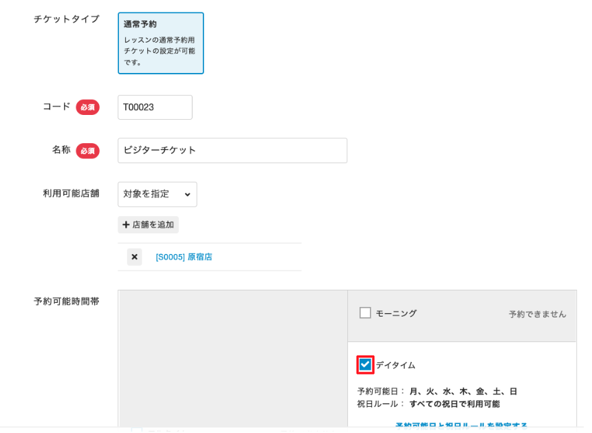 ビジターチケットの設定方法については、上部に戻り「平日デイタイム月4回+ビジターチケット購入で追加予約可能なプランの設定例」の手順8以降をご参考ください。