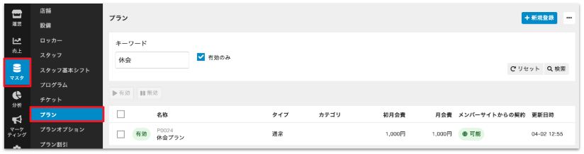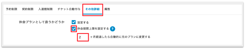 - 休会期間が複数ある場合(1ヶ月の休会、2ヶ月の休会、3ヶ月の休会など)は休会期間ごとにプランを作成する必要があります。