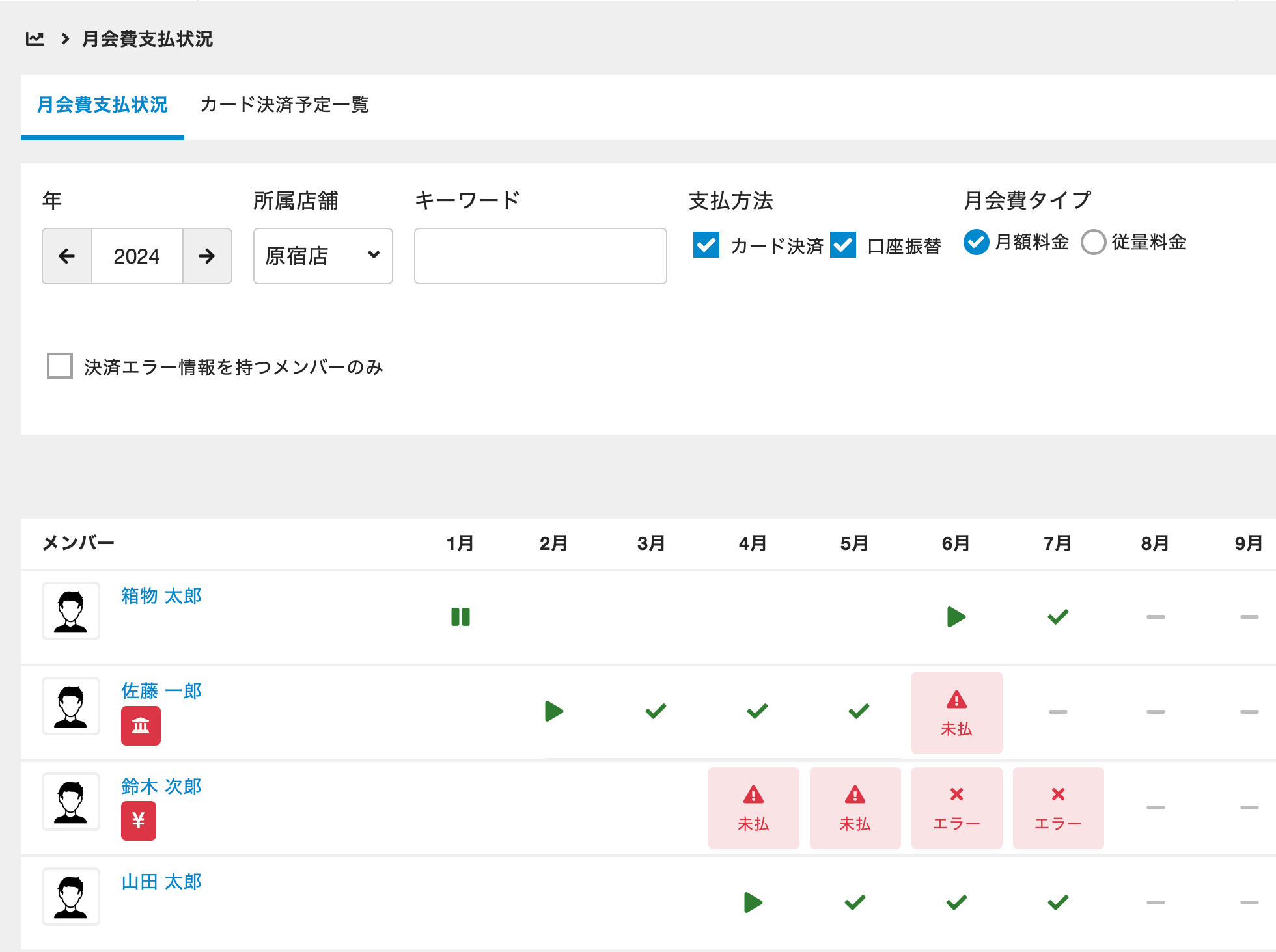 未払い分を請求したい場合は、現金や銀行振込などでお支払いいただくか、翌月の月会費に追加して請求する事が可能です。