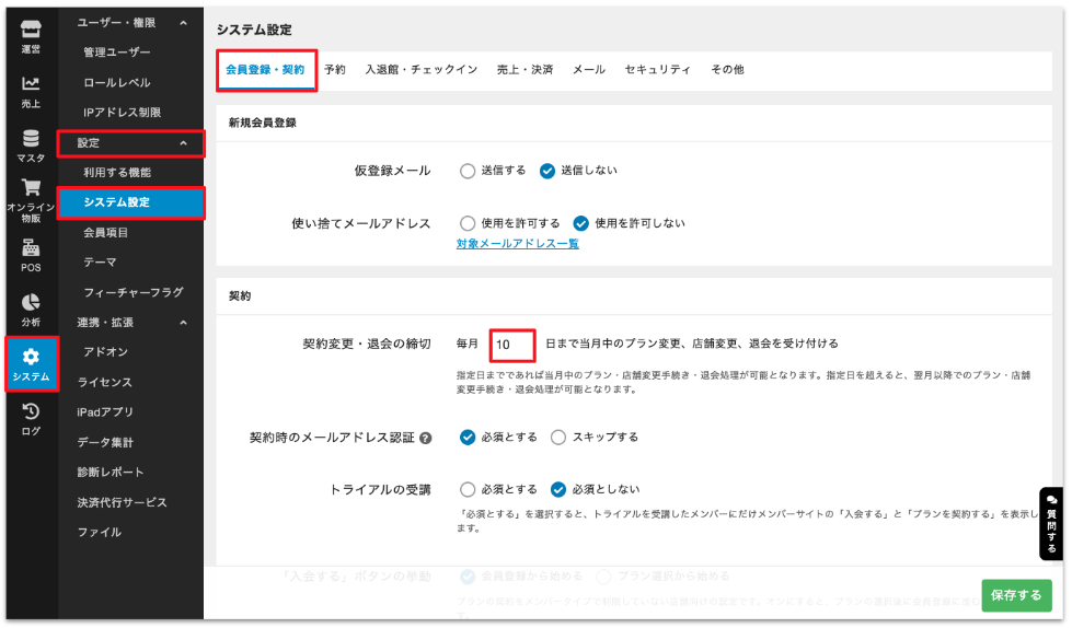 - プラン退会の受付締切日を「10日」に設定