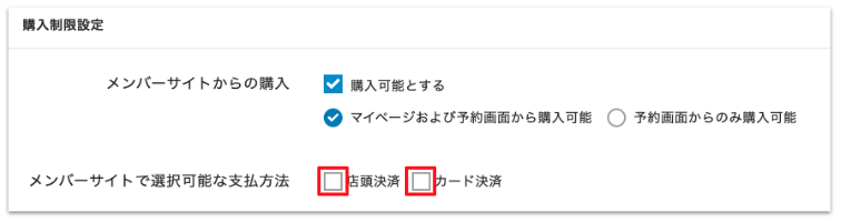| 店頭決済のみにチェックを入れる | 事前に予約のみ済ませて当日に店頭で決済する方法。 なお、支払方法が店頭決済のチケットはマイページからの購入は不可となり、予約スケジュールからレッスンを予約する際にのみ購入ができます。 |