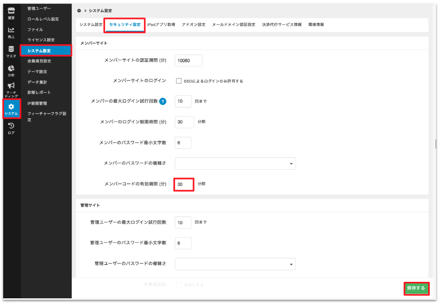 [システム]>[システム設定]>[セキュリティ設定]>[メンバーコードの有効期間 (分)]の設定を変更して[保存する]をクリックします。